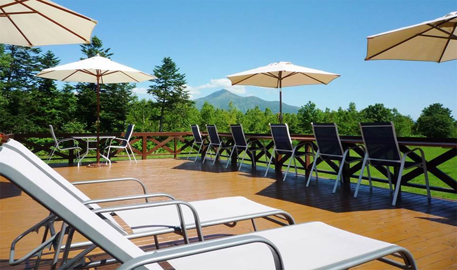 秀峰・羊蹄山を望む広大な牧草畑を眼下に、パノラマテラスで「たき火」を囲み、また、心地よく揺れるスウィングチェアでココロからリラックス。